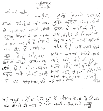 17 September 83 Dear son, Marish, Kukoo mama brought your letters to Paonta Sahib. Jiji mausi is recouping and resting in Richa and Nidhi’s home. Otherwise Jiji is all right now. Nani is also here. How are you “ tube light puq puq ”? Earlier also I wrote to you that I will come to meet you on 25th September. If you need something, write immediately because I will leave Delhi for Yamuna Nagar on Sept. 24 _ OK. Like a good and lovely son, study with all your heart. Be good to your friends and listen to your teachers. Lots of kisses Your Ma, It is very hot here. How is it at Dehradun ? Love for all your friends. Convey my greetings to Dhariwal auntie. – Ma -------------------- |