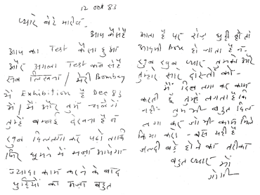 How are you ? How did you do in you test and when will be your next test ? Write all about it to me. My exhibition in Bombay will be in , Dec, 83. We both will go to Bombay. Won’t you like to see